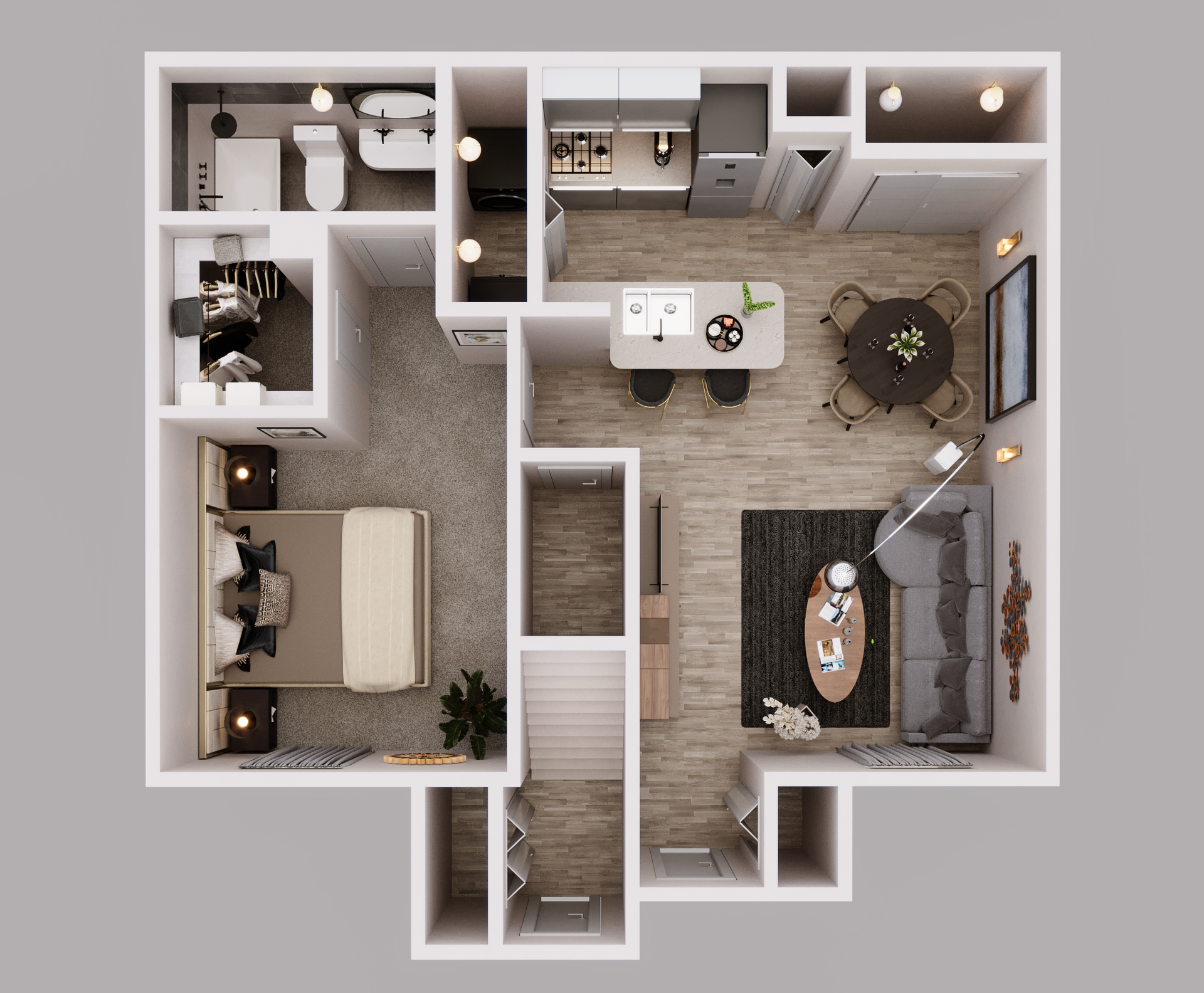 Storage is effortless with a walk-in closet and additional storage in the living area, ensuring your belongings find their perfect place. Enjoy the added convenience of a full-size washer and dryer included in all our updated 1 bedroom homes.